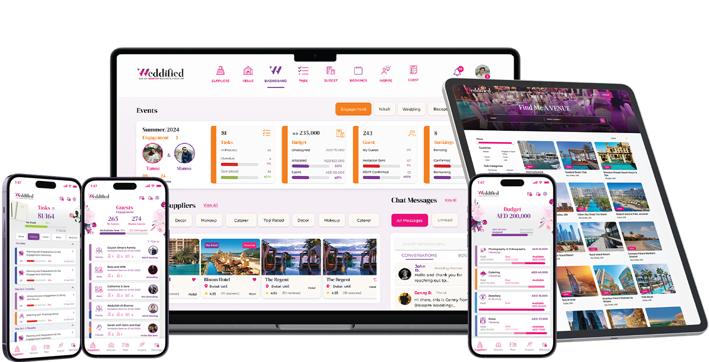 Welcome to Weddified, the revolutionary AI-based wedding planning app designed specifically for the UAE, Saudi Arabia, Qatar, Pakistan and the broader Middle East region. At the heart of Weddified lies a deep understanding of the unique wedding traditions, cultures, and preferences that define this vibrant region.